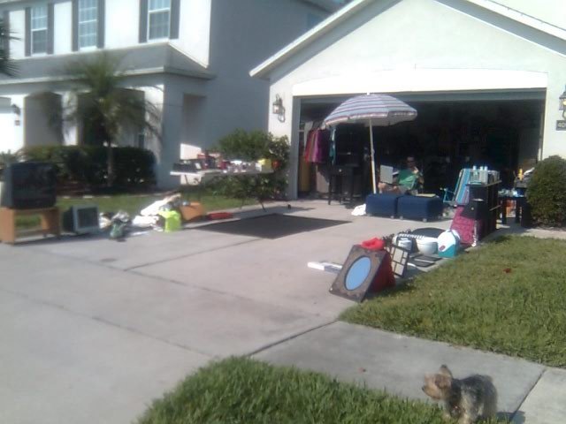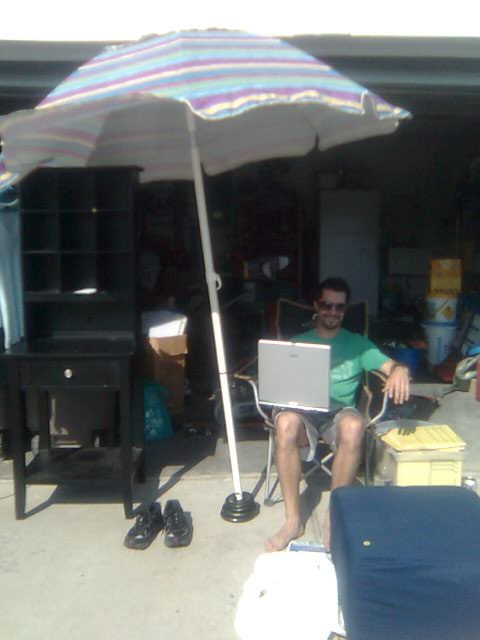 Well, (it’s Nicole) it has been a busy week of preparations for our trip. We have sold over $600.00 on ebay of clothes and drapes etc and our garage sale has brought in a little over $200.00 so far. Here is a great picture of Adam in his glory at our garage sale.