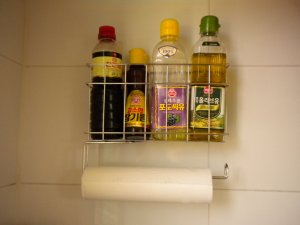 Also, just a thing to point out, everything for the kitchen is made with suction cups (same with the bathroom) This is a neat sorting element I found at EMart. I like how the paper towels can go conveniently right under the cooking oil, since there isn’t much counter space.