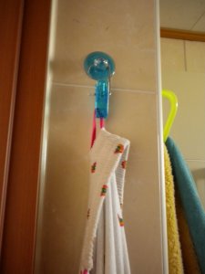 In the bathroom, everything is suction cups with clips, that way towels and such can hang off the walls.