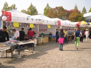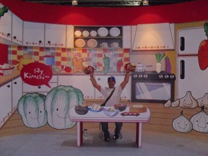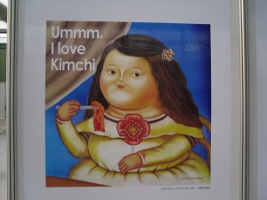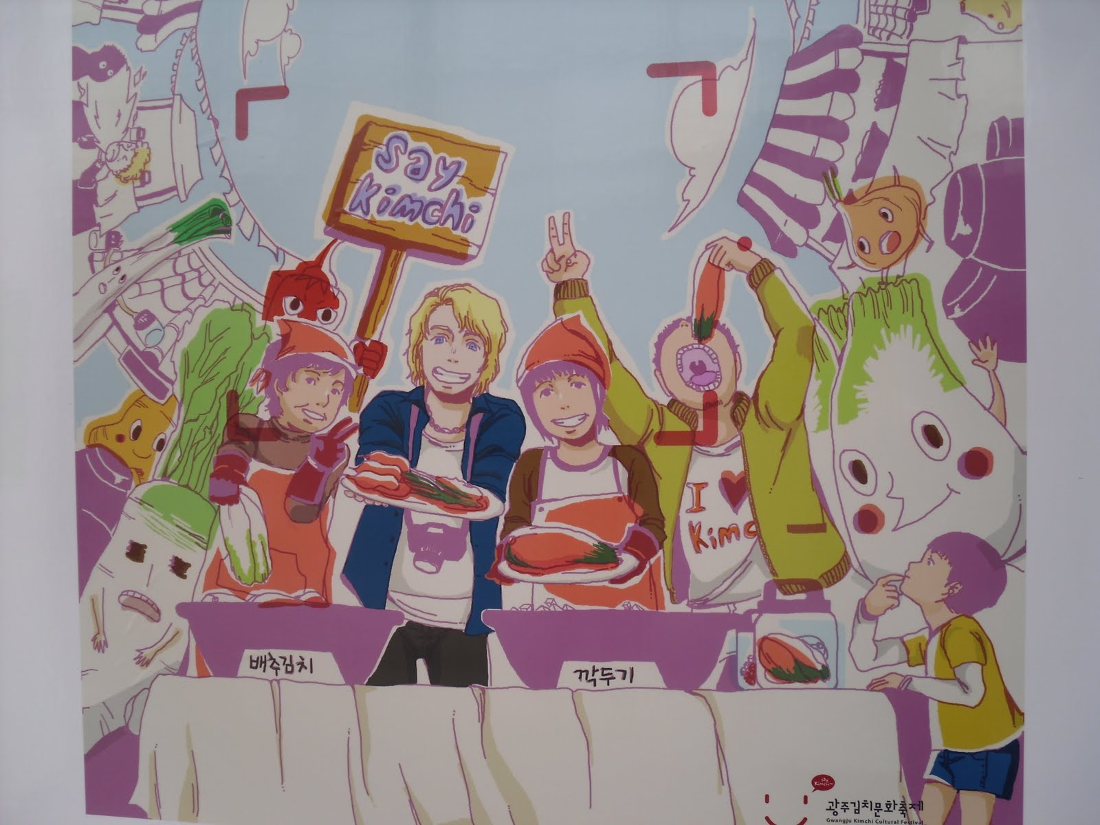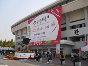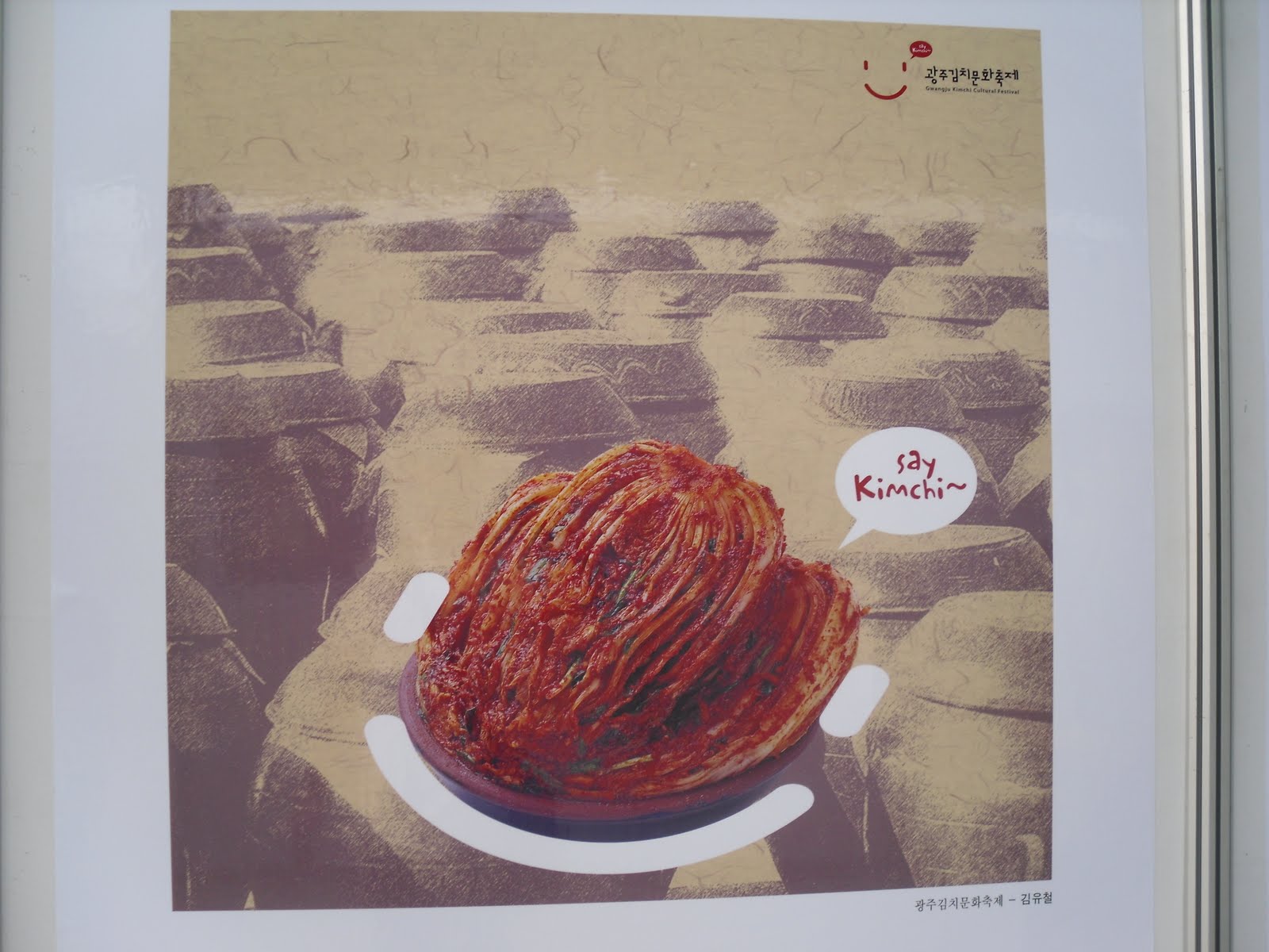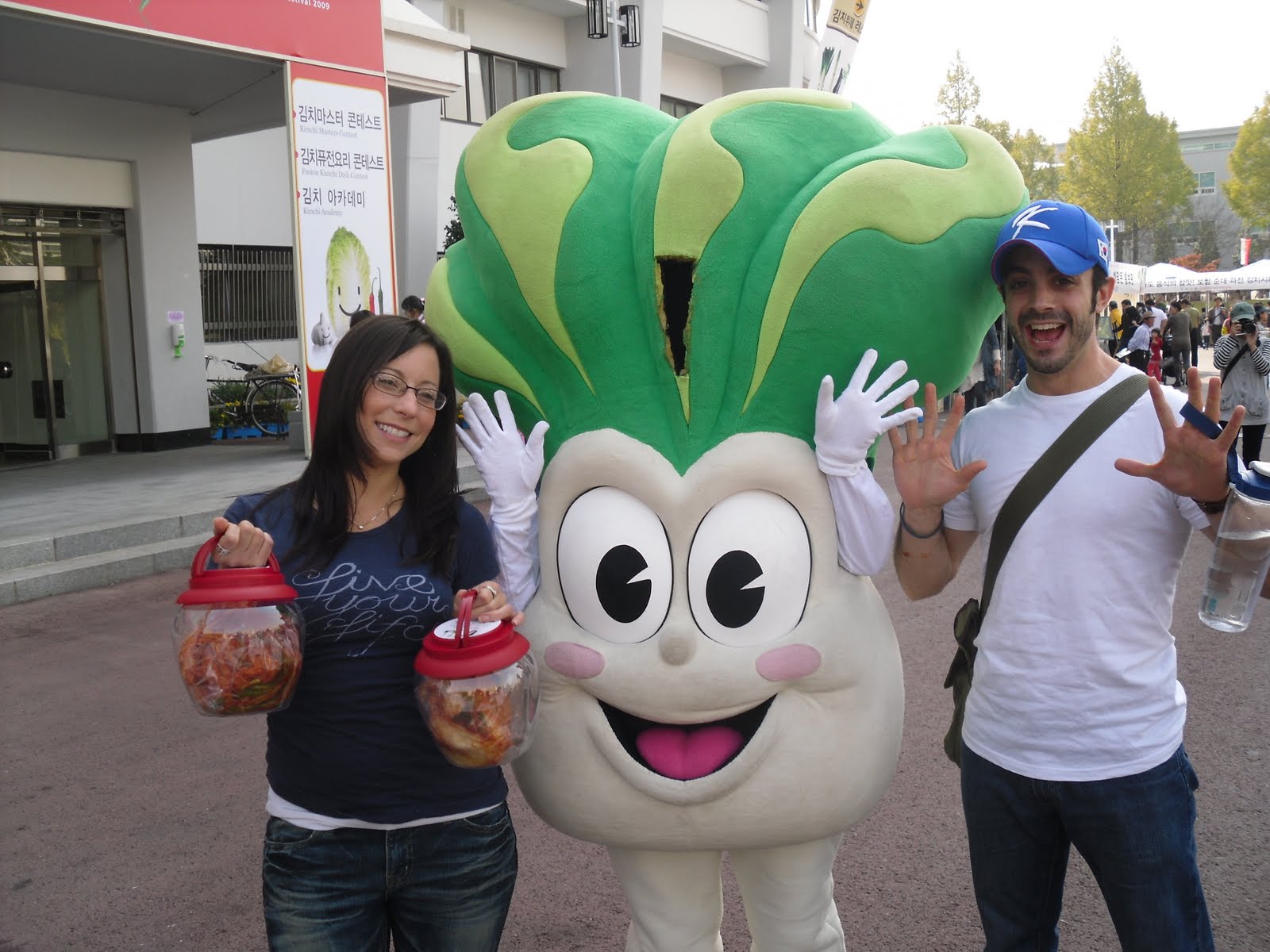 To begin, our Saturday started off (minus the smashing breakfast prepared by moi) with a trip to the very cool and supposedly very famous Kimchi Festival in Gwangju. The Festival took place alongside the world cup stadium and featured samplings of most any kind of Kimchi you could think of, along with some very cool exhibits on the history and culture of the fantastic Korean dish. Vendors lined the parking lots selling other edible selections that ranged from crazy fresh lookin meats to wafer cookies. Our friend Natalie almost got us tossed for stealing one but alas, the dumb looks on our faces once busted was our key to freedom yet again.Not nearly as many foreigners as I suspected but there were a few that seemed to be taking in the festivities with the locals. Here’s a sampling of some Kimchi art that was displayed in one of the exhibit halls.