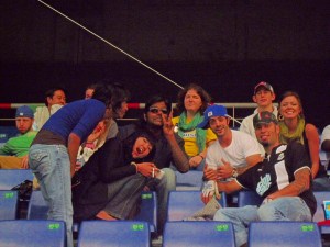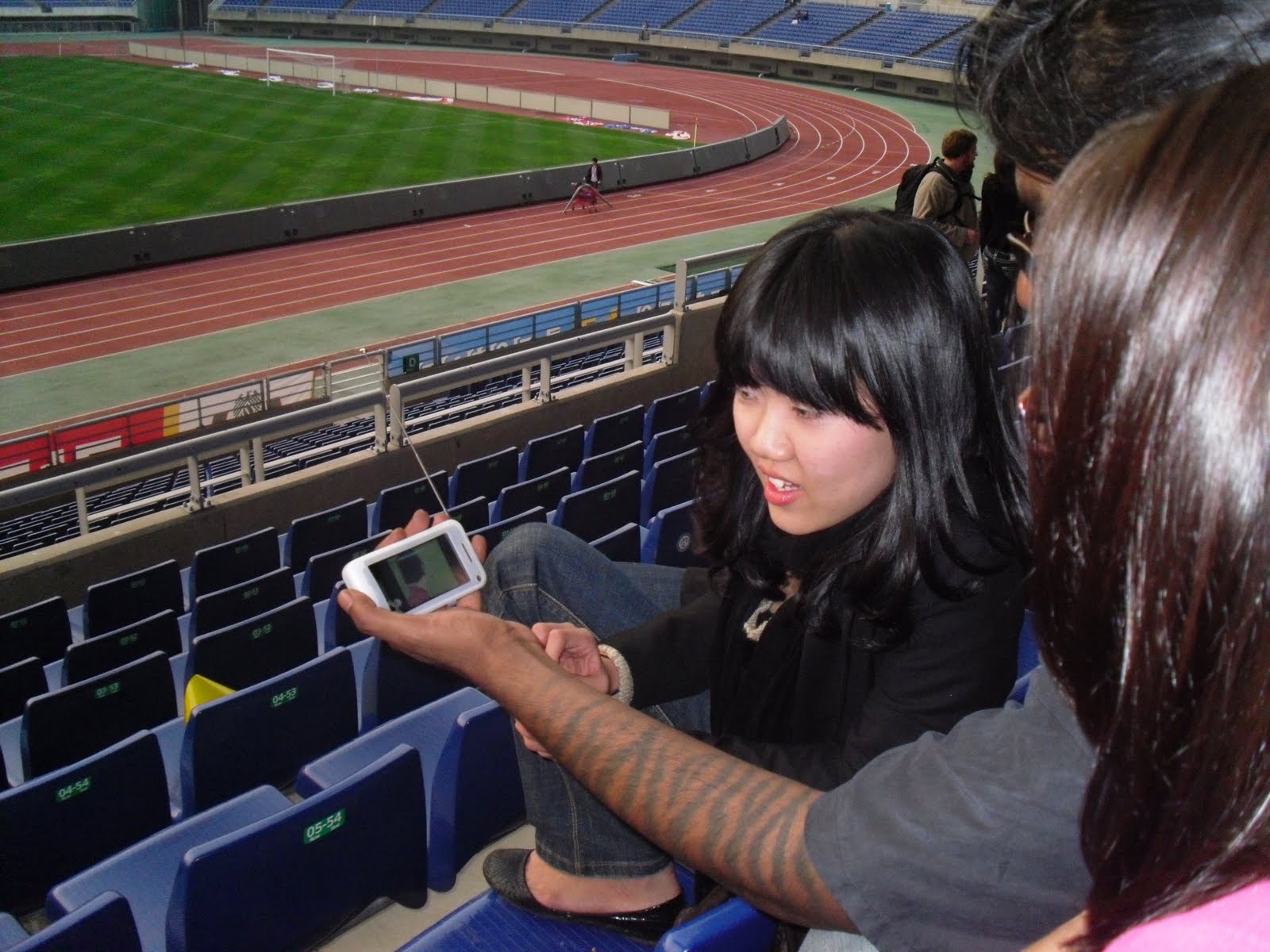 Ok enough of the nerdy stuff. So after the fest we marched it over to the World Cup to meet up with some folks who were gathering to bid some fellow co-workers goodbye in typical foreigner style, drinks, drinks and a bunch more drinks.The soccer game as usual was packed out and sounded like a golf match anytime did anything halfway decent but we’ve come to expect smaller crowds as the Gwangju Phoenix have fallen from grace quite quickly this season battling it out for 10th place in the division nowadays. The highlight however did come from our section as Nicole attempted to explain to the group how a lady at our gym was hula hooping while reading for one hour in our gym the other day. When her words weren’t enough to paint the picture she stood up and innocently enough gyrated to simulate the movement…this was immediately caught by the camera man (which was probably because she has an ass and Korean dudes don’t see much of that) and blasted up onto the jumbotron for the 100 or so people at the game to see. This was only made funnier moments later when some little Koreans felt compelled to mimic the interesting cheer technique a few moments later a few rows in front 😉