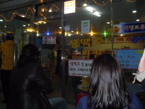 The score at that time was 5-1 in favor of the opposing SK Wyvern’s (i think its a dragon…) so spirits were low but little by little they battled back and in the 7th inning tied it up 5-5!At this point we had been booted out of the stadium and asked to watch elsewhere so we found a convenient store that looked like it had been somewhat transformed into a sports bar to show the game on their massive 21 in television. We popped a squat at one of the tables outside, grabbed some beers and watched through the windows as the magic that only a Tiger could drum up ensued in the bottom of the 9th with 2 outs…….