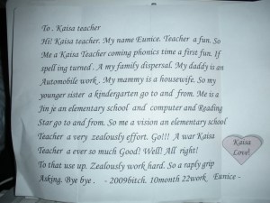 November 6, 2009June 25, 2012 Adventures We Seek The Joys of Google Translator A coworker received this note from a 6 year old student today…enjoy! Discover more from Adventures We Seek Subscribe to get the latest posts sent to your email. Type your email… Subscribe Share this:Tweet Email a link to a friend (Opens in new window) Email Like Loading... Related