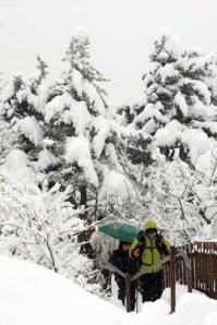 This picture was taken as the Snow falls on a quiet mountain trail – Visitors hike Mount Seorak’s Gwongeumsung trail after a heavy snowfall blanketed much of the Gangwon region on Monday. Mount Seorak is in the North Eastern corner of the country. I have been told one of the most beautiful spots to climb. It is too far for us for a weekend get away, so we will have to wait until we have at least a 3 day break to make it up there.
