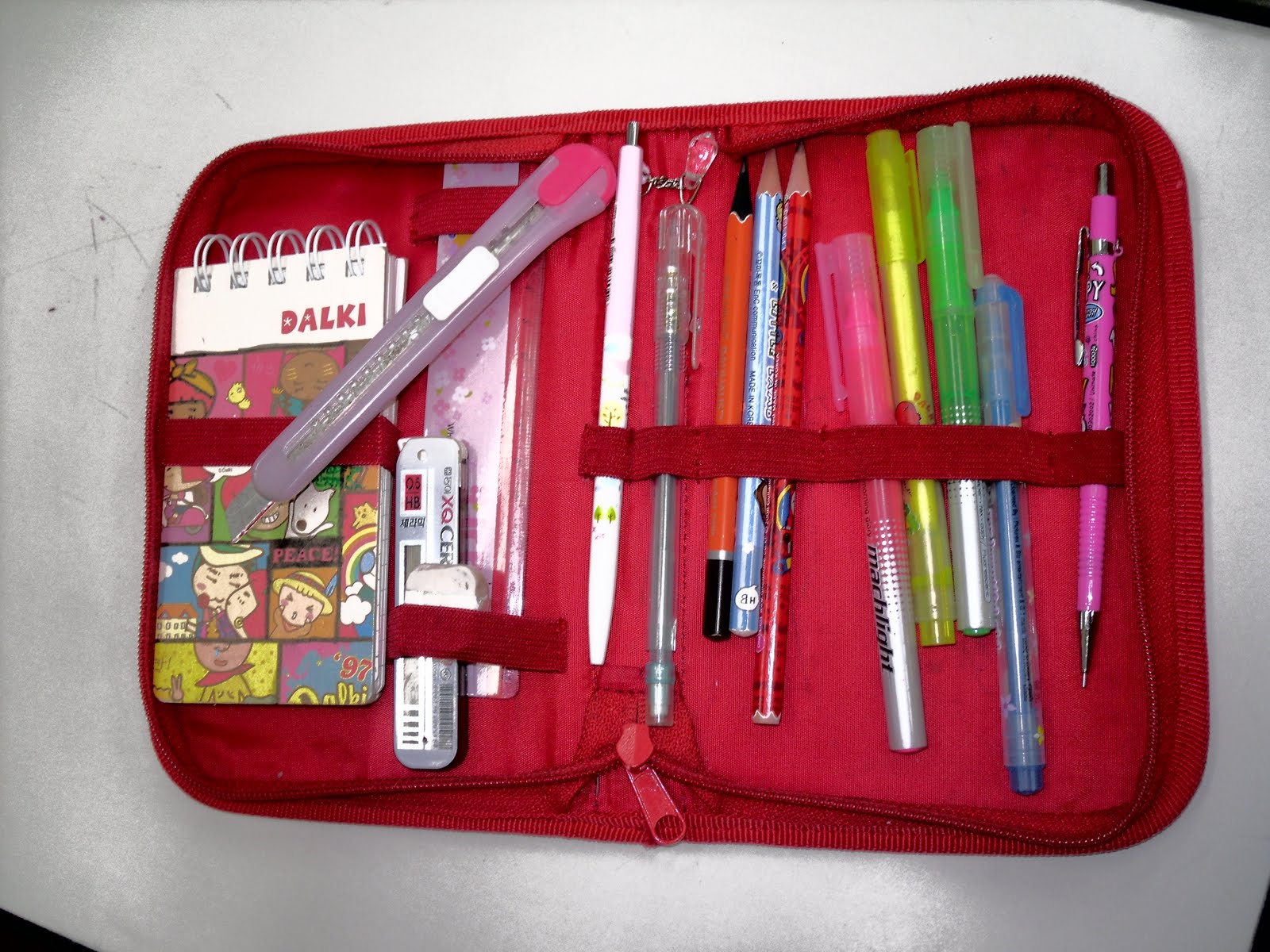 Inside you can find many things ranging from non ink highlighters to stickers and of course every eight year old carries with them a box cutter knife.