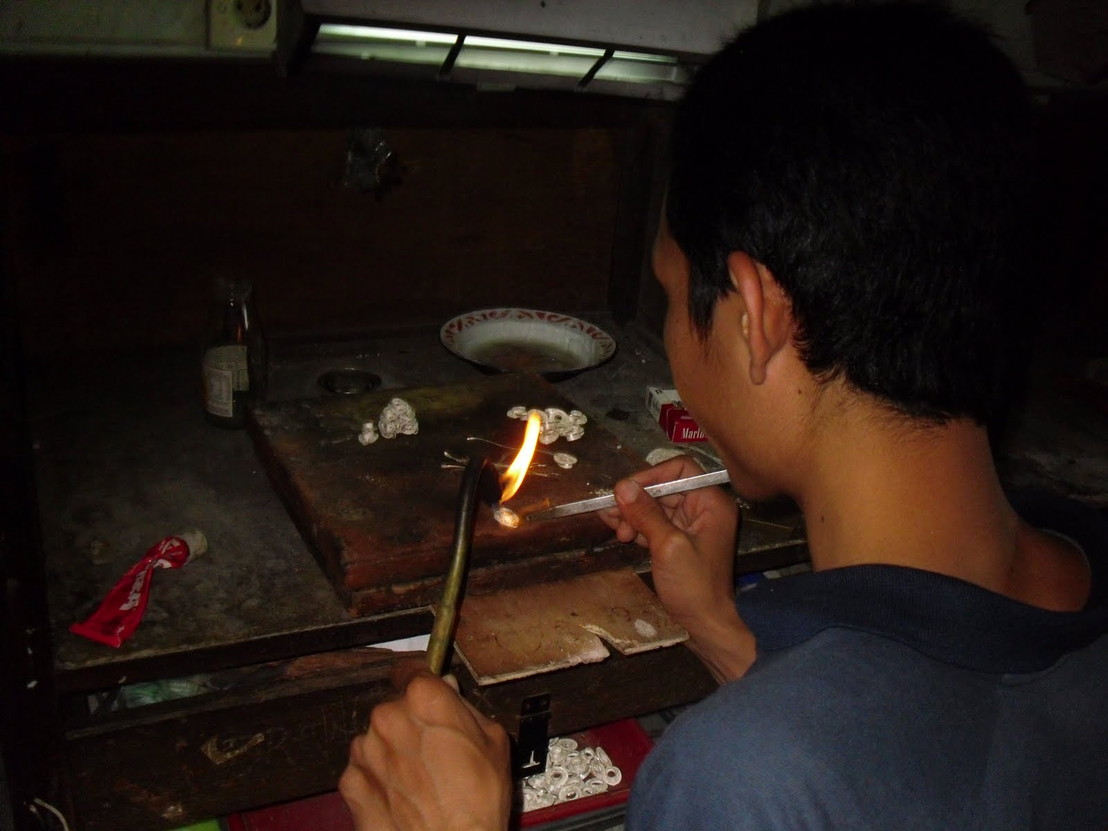 Then, we went to the Silver Factory which was set up like a sweat shop. We were toured around the place and the people working were hunched over in their stall, most without shoes or shirts…no gloves or protective eye wear…soddering and creating jewelry. Each artist is paid by each piece they finish.