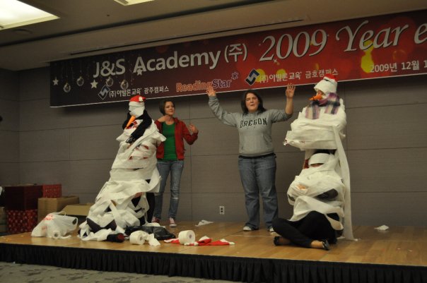 Nicole’s group did a creative take on frosty the snowman by wrapping up people in toilet paper which was a big hit and a lot of fun to watch, especially since Nicole was one of the lucky ones that was being covered in the t.p. Check it.