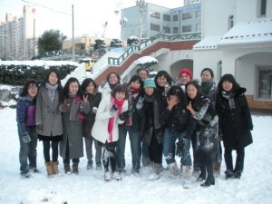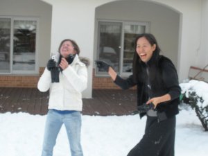 Today we lucked out with a conference day and at 1:30 our boss walked in…and said, “wanna have a snow ball fight?” none of us really knew how to react. I was like Jinja? (really?) are you serious, what was in your breakfast. Sue is usually extremely reserve. She came in two more times and at 3:00 we were all out in the snow. Sue was waiting with a stack of snow balls and threw the first few balls before any of us had the courage to hit her with one. Then, we went for it and everyone began having fun. 20 teachers all out in a field stuffing snow in each others faces. What a great way to spend the end of 2009. (sue is the one in black on the right)