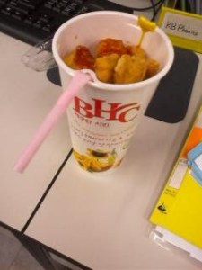 Yesterday at work my whole class was treated to a cocpop. (Coke, Popcorn Chicken) by Bona’s mother. BHC Chicken, which they swore to me stood for nothing…I was hoping Boss House Chicken or something cool like that, has a snack pack type meal. It comes in a togo cup, not any bigger than a medium size coke at mcD’s the bottom half has fanta or cola inside and the top has a small cup that fits just perfect above the liquid and holds mini chicken nuggets that taste a lot like cafeteria playdoh nuggets. There is a perfect hole through the nugget plastic part into the soda for a straw. For less than $2.00 KFC popcorn chicken may never win in the Gwangju snack pack race.