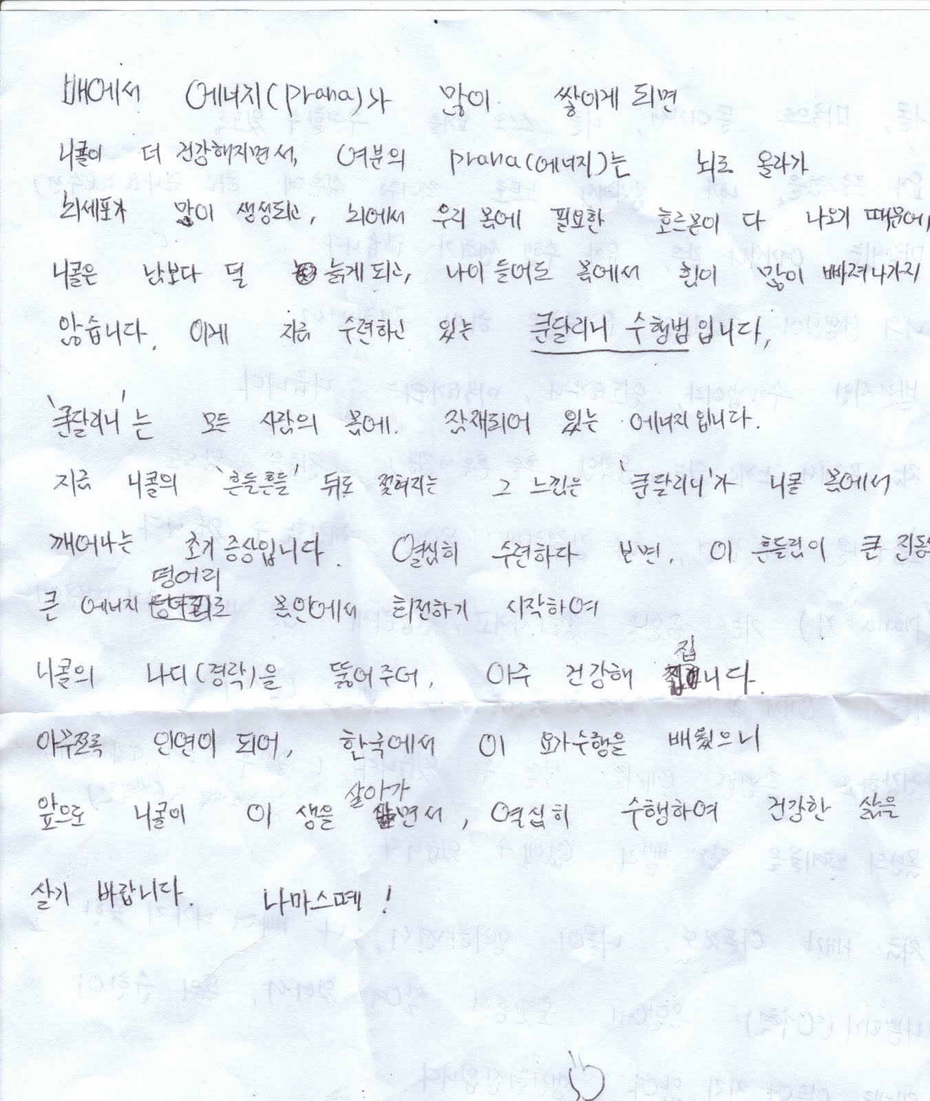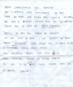 This letter, translated through people at work says that she wants to make a M-F yoga journal for me so I can practice on my own at home. She says that her teacher has been practicing for 30 years and it is not like yoga from America or India or China or even Korea. It is a mix of Khundalini breathing, stretching, Chakras, and pushing your body to its absolute breaking point…in a good way.