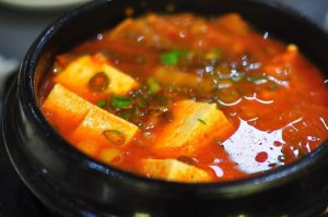 This is Kimchi Zzige soup, it can be spelled many different ways. It is a spicy red soup with cabbage, tofu, scallions and whatever else the cook wants to put inside.