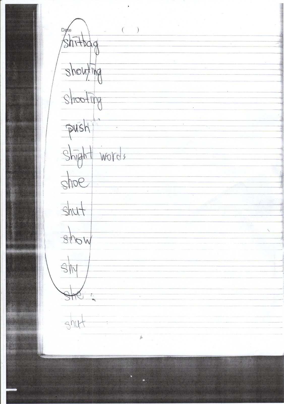 Today in phonics class the kids had to go home and write down 5-10 words using the sh blend we were learning in class. Helly went home (she is a sweetie, don’t let the non smile and name of Helly make you think any different) and this was her homework.