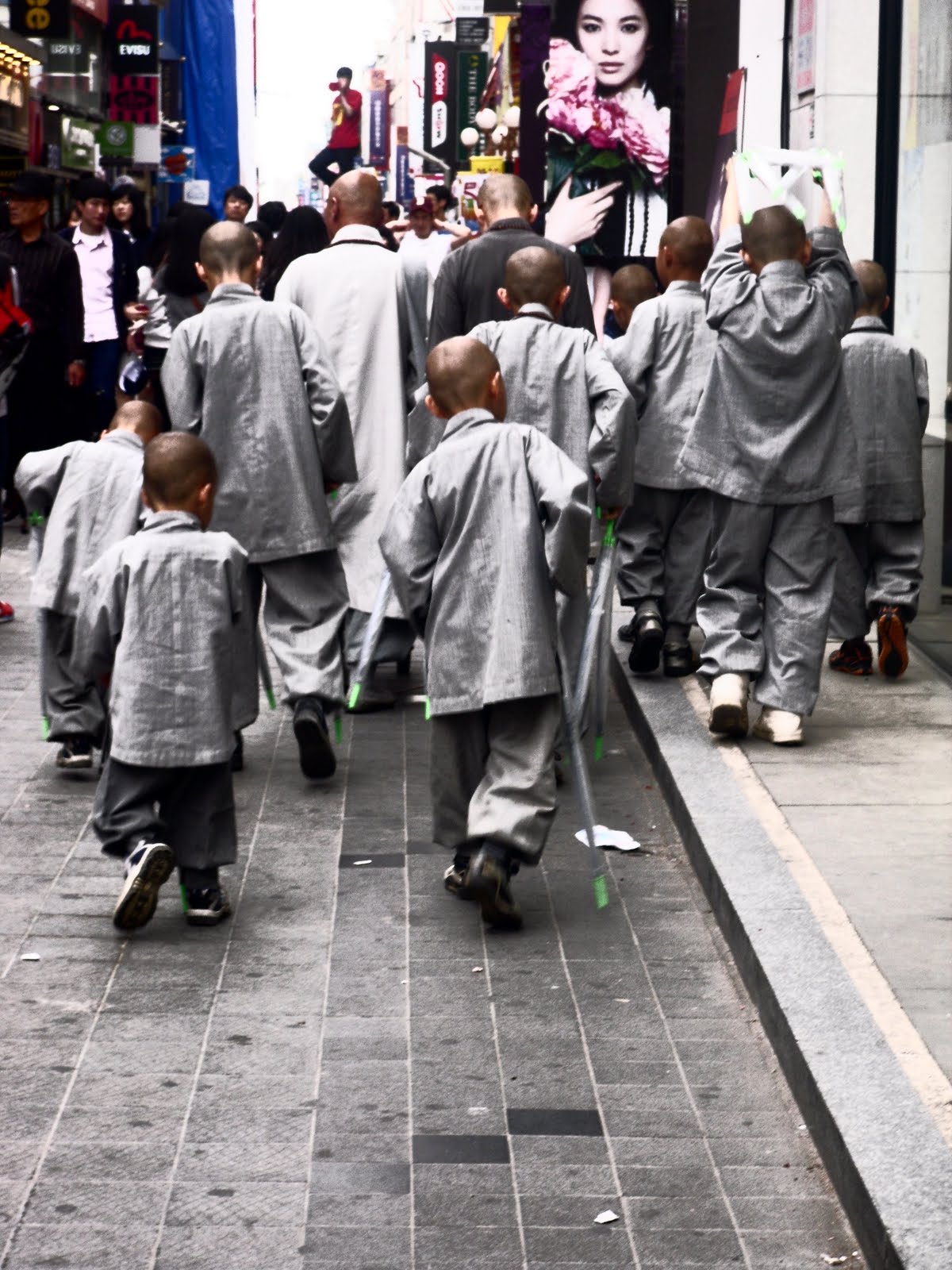 yesterday while walking downtown we saw a group of monks…of all ages…all men.they were all holding clear umbrella’s with neon green handles and dressed in the beautiful grey material that we normally see them in. our wild minds were brainstorming and although we don’t know exactly, we think it is an orphanage of some type who raises boys. we could be completely wrong, but that is the assumption we made yesterday.