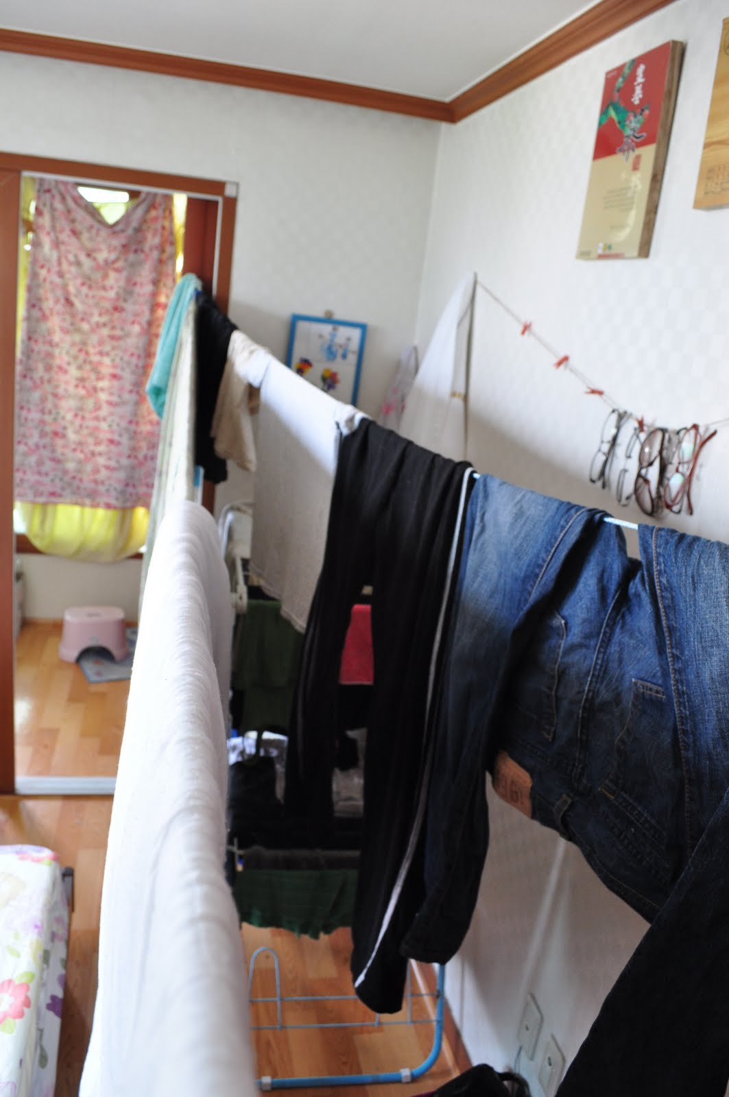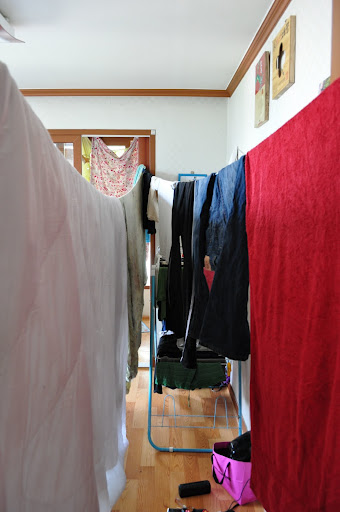 We do not have a dryer and the weather has not been perfect enough for us to use the roof…so this is what our apartment looks like with one drying rack and two ropes …