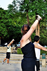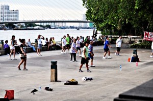 then aerobics class started and we jumped right in. In the middle of the park, filled with people, about 50 or so Thai men and women…and two foreigners…did awesome techno aerobics in the park, to a great remix. We had a blast, but it got way too complicated for us so we packed up, took the water taxi back and made it to our hotel.