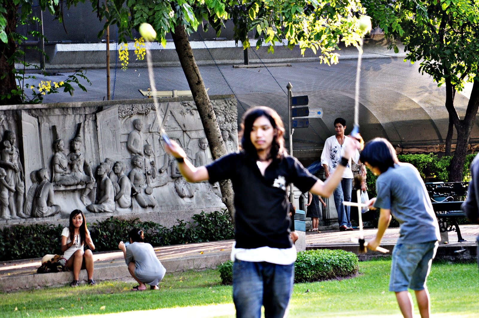We found a 7-11 and got slurpee’s and then found a local park too park it for a bit. There were jugglers, hula hoopers and tons of people socializing, reading books, picnicing… We found a bench and took pictures and relaxed…then, as we read, the national anthem came on the loud speakers and everyone stood (us too)…