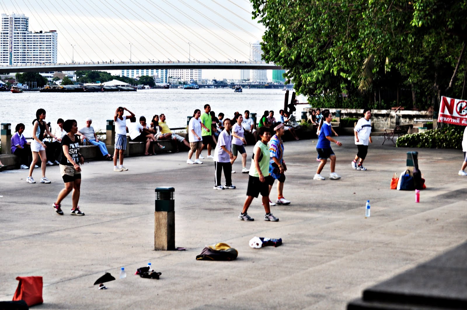 then aerobics class started and we jumped right in. In the middle of the park, filled with people, about 50 or so Thai men and women…and two foreigners…did awesome techno aerobics in the park, to a great remix. We had a blast, but it got way too complicated for us so we packed up, took the water taxi back and made it to our hotel.