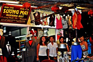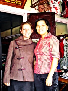 After some lunch we walked the streets lined with tailors, shoe shops and pretty much any other type of clothing accessory store imaginable. Nicole spotted a dress she fancied….yes, fancied, at a storefront and so we asked about the price and fabrics available. For a whopping $20 she could have the dress made in 3 hours and that was all we needed to hear as Nicole picked her color and fabric from the lovely ladies of Morning Mist tailors and off we went.