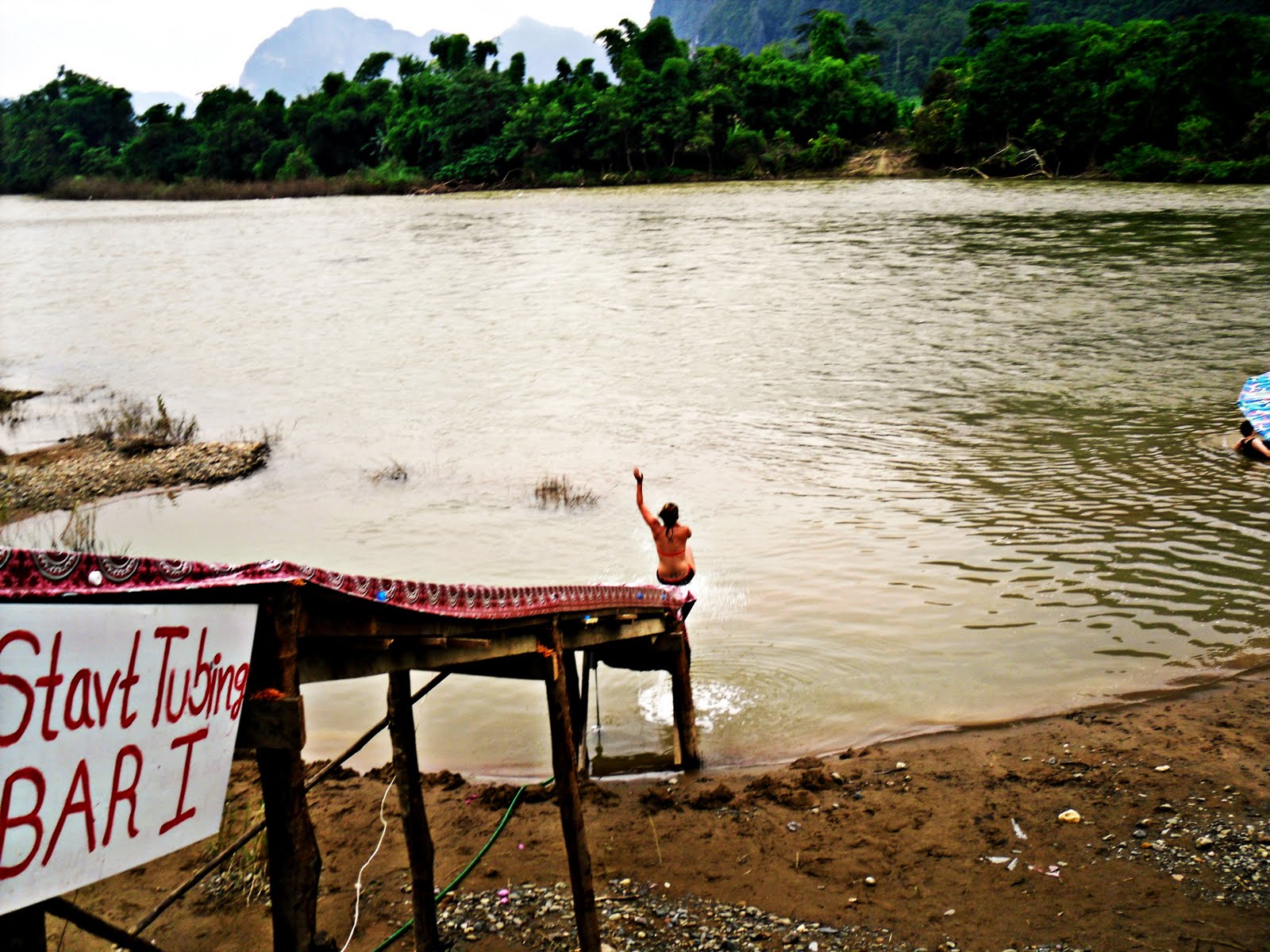 The tuk tuk drops you off with your tube at bar #1, after having a registration number written on your hand in marker, Adam and I were 17 and 18. The bar gives you free shorts (shots) all day of homemade bamboo whiskey and you of course partake in a beer lao. After a few slides down the big slide into the river, you head off in your tube to float a few 1000 feet down the river to bar 2.