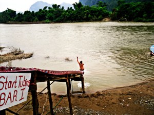 Vang Vieng is known for its party time tubing in the same way Daytona is known for Bike Week…everyone comes for a good time. Adam went ahead and played along.