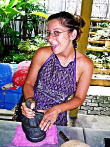 Next we cooked up some entrees. Nicole worked on the more complicated Pad Thai while I made a dish of chicken and roasted cashews. Following the entrees we started in on smashing up the ingredients that would be added to our curry mix. This was a sweaty ordeal that we were told many locals now use a blender to create. We however found no challenge in that and so we smashed like hooligans for about 10 minutes until the paste was formed.