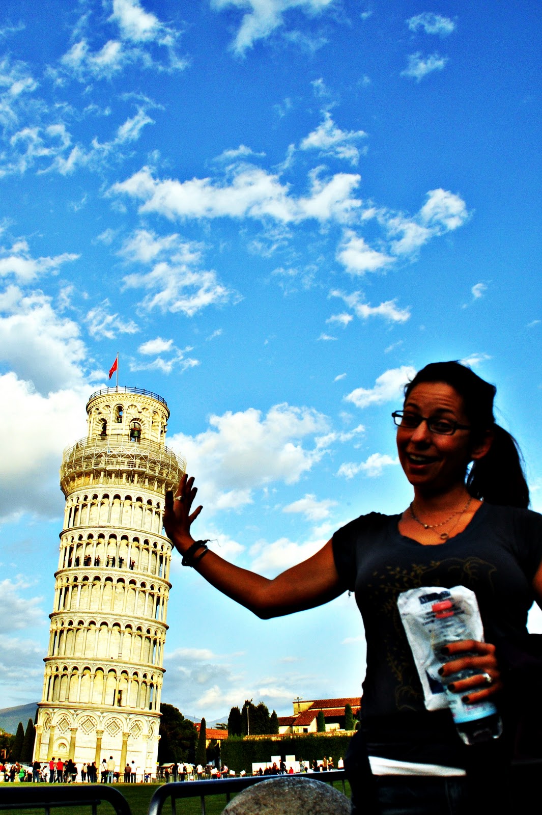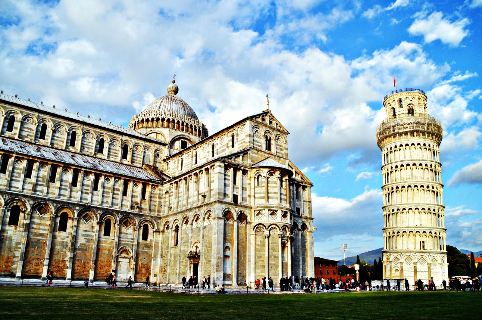 The building, if learned about in school may not at first appear to be that impressive, honestly because you are expecting more. BUT, Ladies and Gents, I thought that the leaning piece of architecture was absolutely stunning. Both it and the church it stands next to is made from a very white marble that is a great contrast with a beautiful blue skied afternoon.