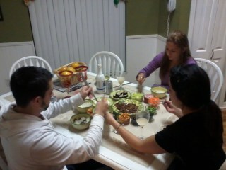 We bought the goods to make our own homemade bibimbop…for about 3 x’s the price that you pay in Korea. A bottle of Makali was $8 where in Korea it is closer to $2. Shawn and Tiffany came over to feast on Gimbap, Kimchi, Sprouts and Bibimbop with us. We picked up one Korean pear and some Peppero for dessert.