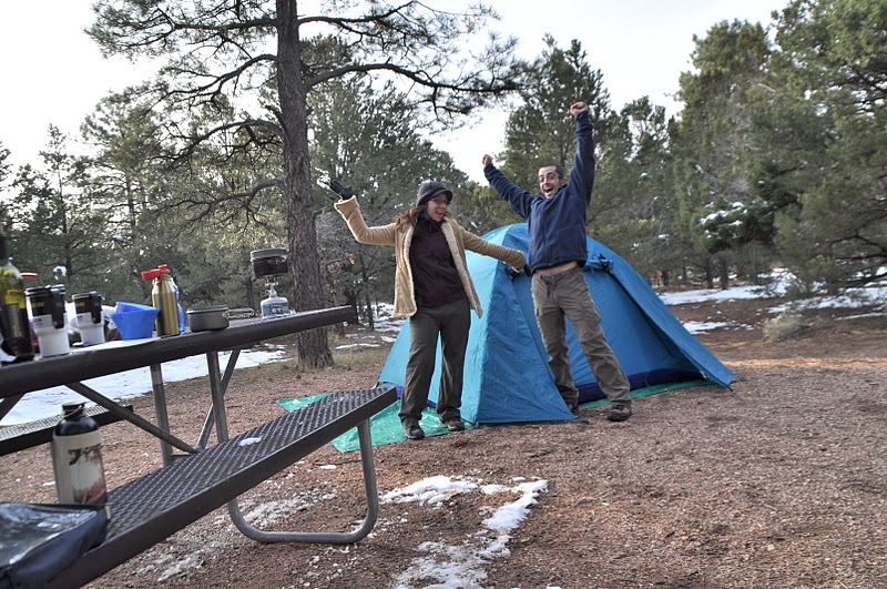 We made it after 3 days, to The Grand Canyon…that huge thing in the middle of America that many dream of seeing. We have arrived! The first thing we did was head to the camp site to set up camp. Across the street from our camp site was a deer…just hanging out. There was snow on the ground in most of the camp sites, but we found one that had a nice clearing for our tent.