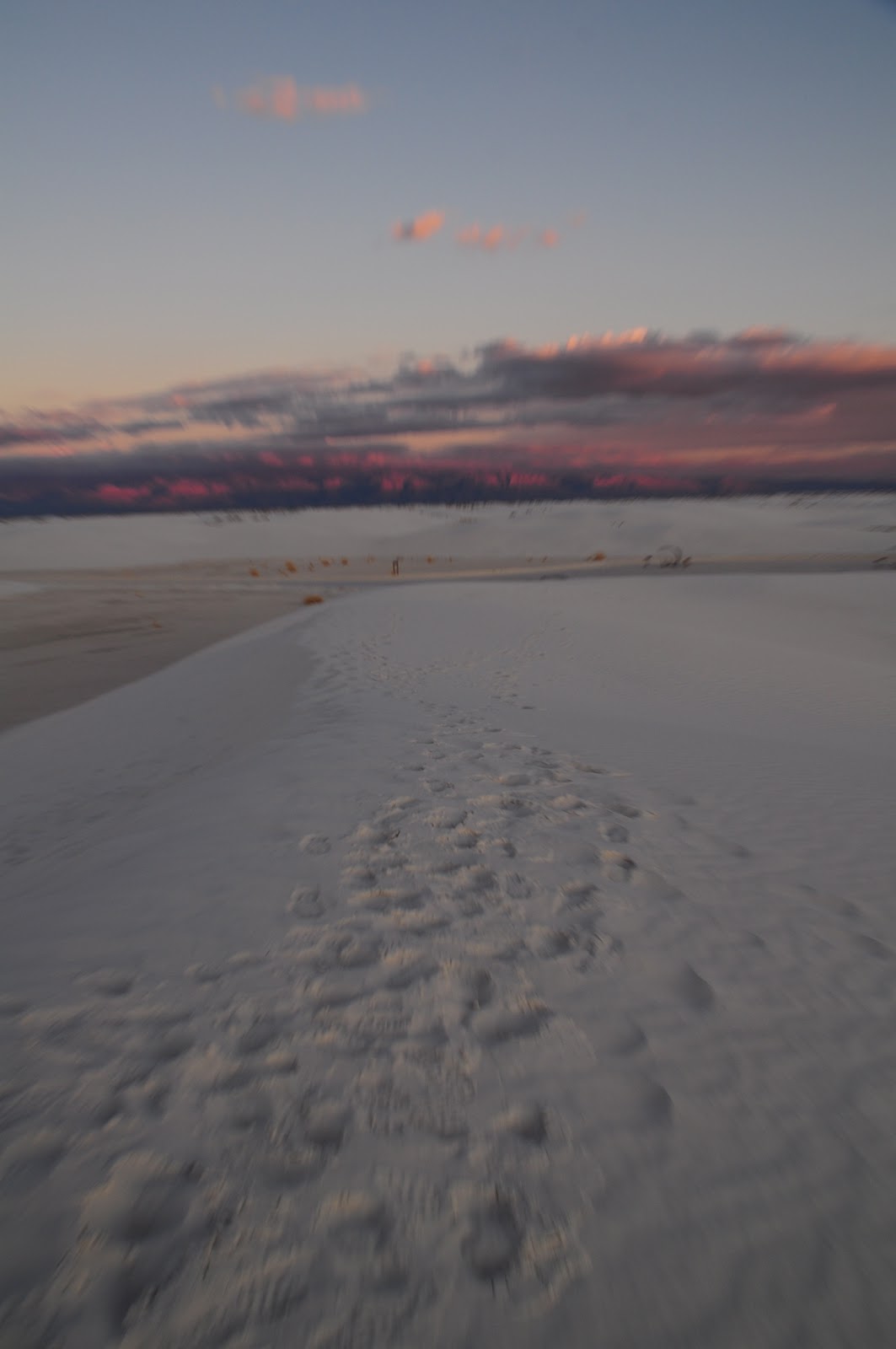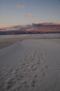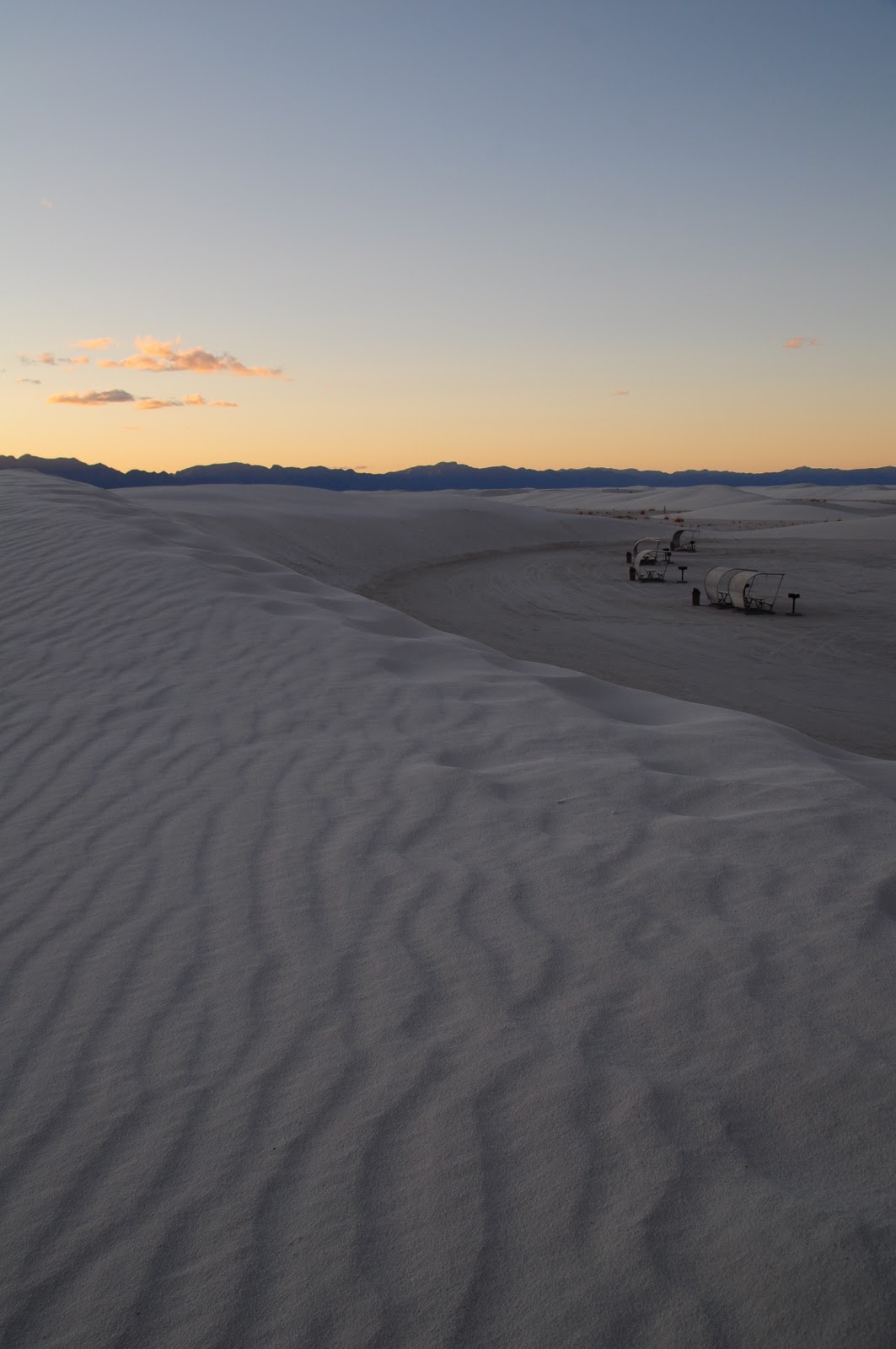 We headed off to the East in search of New Mexico. Immediately we entered desert and it was exactly what we hoped for. We drove and drove and drove. We went through the Missile Range and where the first bomb was tested. Then, we made it just before sunset to the White Sand Dunes National Park. It was absolutely beautiful. The Sand Dunes made the mountains in the background appear hot pink.