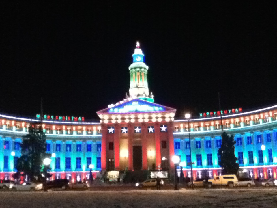 Since 1935, Downtown Denver has lit up its courthouse using more than 600,000 lights. Traffic stops, people look on at all there is to see. There is a nativity scene out front along with very large angels with trumpets hanging off either side of the building.