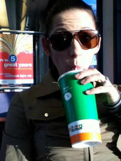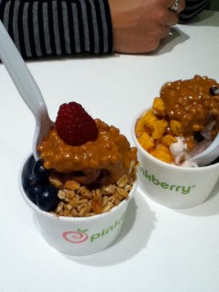 We love pink berry. For a little more than $2 we get mini cups. You pick your flavor yogurt (1 of 5) and then top it with as much goodness that will fit onto without falling out of the cup. Adam usually gets chocolate yogurt topped with granola, blueberries, yogurt chips, and peanut butter. This time, I got their seasonal mint yogurt and topped it with peanut butter, chocolate mini chips and captain crunch cereal!