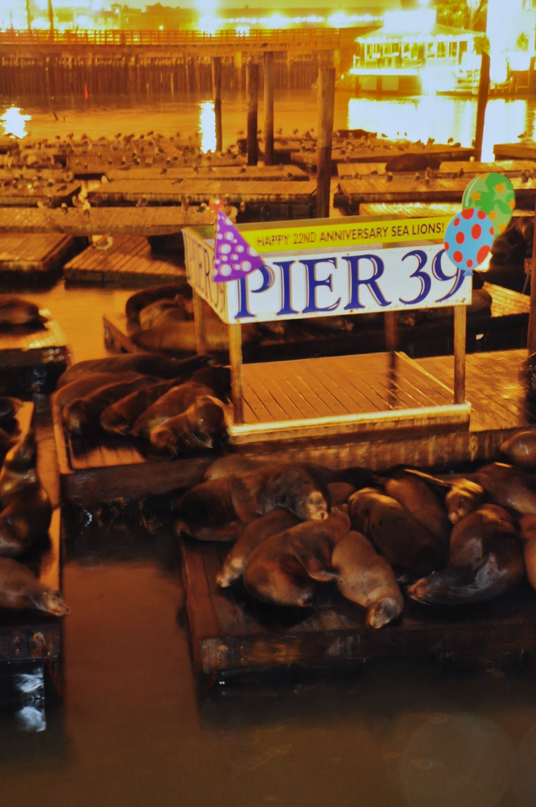 Walking back along the Pier we discovered a full blown family of Sea Lions making themselves comfy on the wooden slip docks of the marina. They were quite vocal and seemed to be enjoying the gathering crowds as they squawked and passed gas repeatedly for all the hear….and smell, if you so chose. 🙂