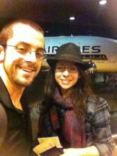 We boarded our A380-400..there were pictures hung on the wall. We had a three seat row to ourselves. Warm towels, earphones, toothbrushes and socks along with a 4 course menu were all handed to us.