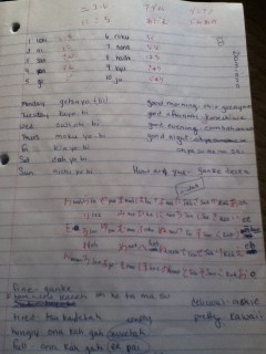 Last night we had a lesson exchange with Akemi. She is wonderful! Akemi just moved into our building and wanted to work on her conversational English, so in return she is teaching us very simple Japanese. Choo, is a dancer…a hiphop and popping dancer. He came near the end and conversed too.