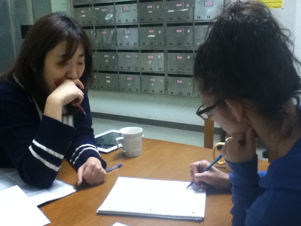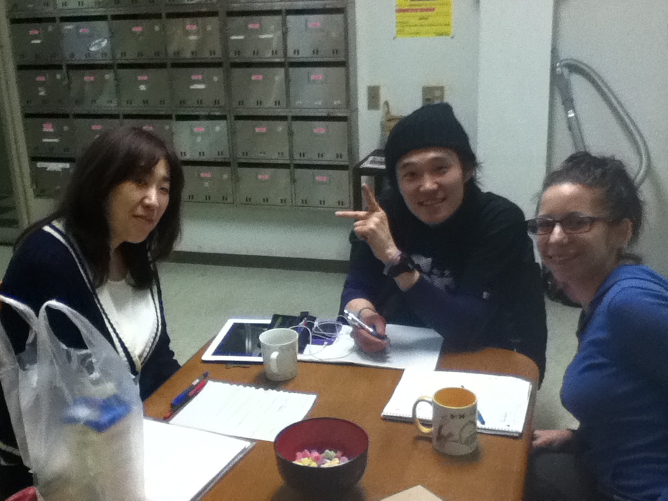 Last night we had a lesson exchange with Akemi. She is wonderful! Akemi just moved into our building and wanted to work on her conversational English, so in return she is teaching us very simple Japanese. Choo, is a dancer…a hiphop and popping dancer. He came near the end and conversed too.