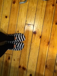 I know we haven’t written much about work, but my favorite part (One of) is that we get to wear slippers at work! I have two pairs of these stripped babies…one for each school campus. It is comfy and makes slipping and sliding around the office quite fun. However, now all my pants drag on the floor and I appear much shorter without my heels on 🙂