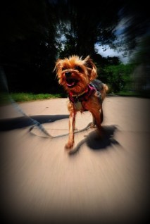 I am doing well. I love to climb on the kitchen table (which is okay with Grandma and PaPa) to watch the kids, cars and school buses go by. I went for a walk with Grandma and did my thing. For breakfast, I had an egg witch I devoured. You should see the back porch – oh, how I love it out there. I would love to get at the squirrels but really, noone will let me do it. I can’t run in the backyard because the slats have spaces which are too large and I might climb through and get lost. Oh well!