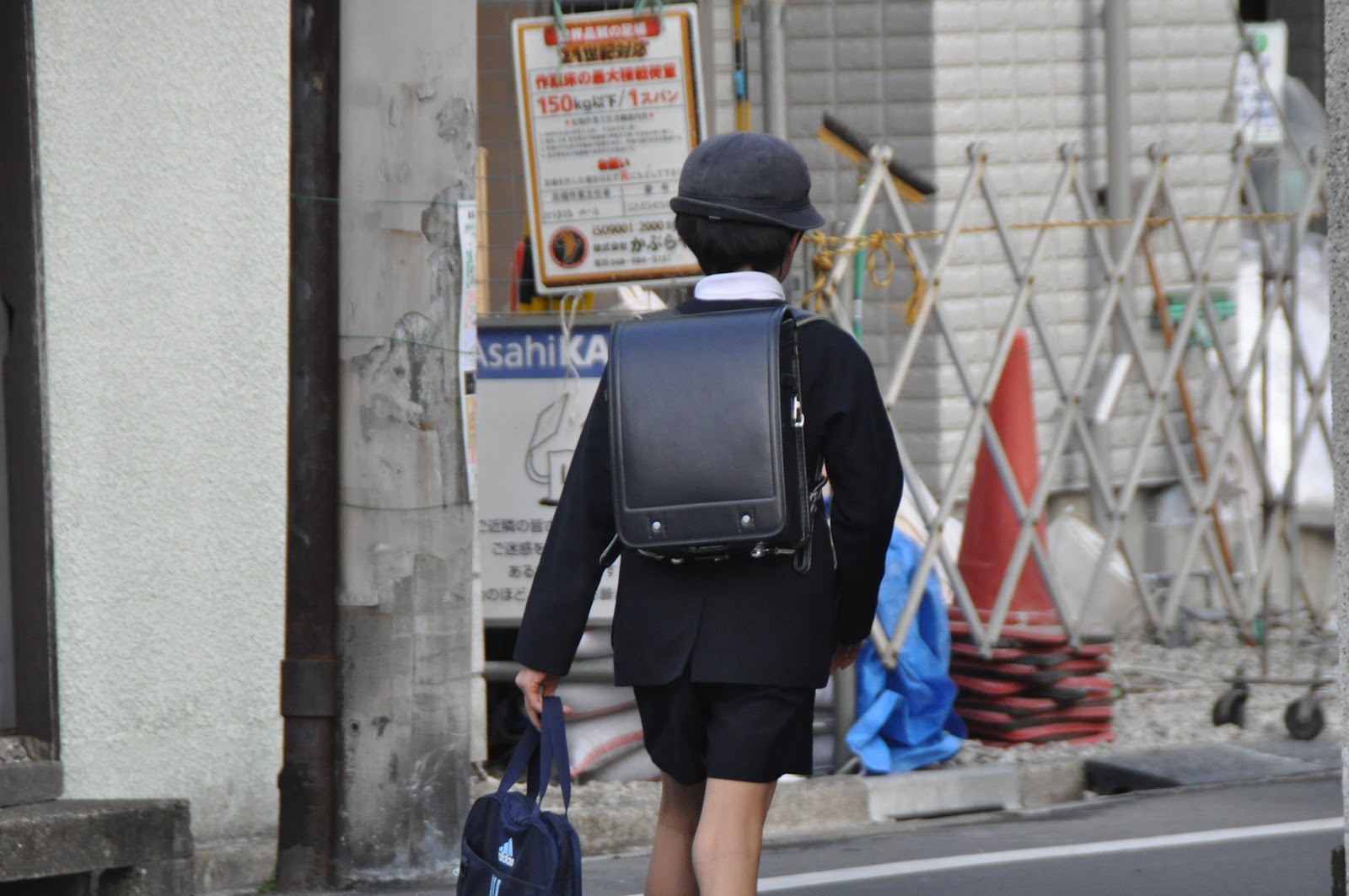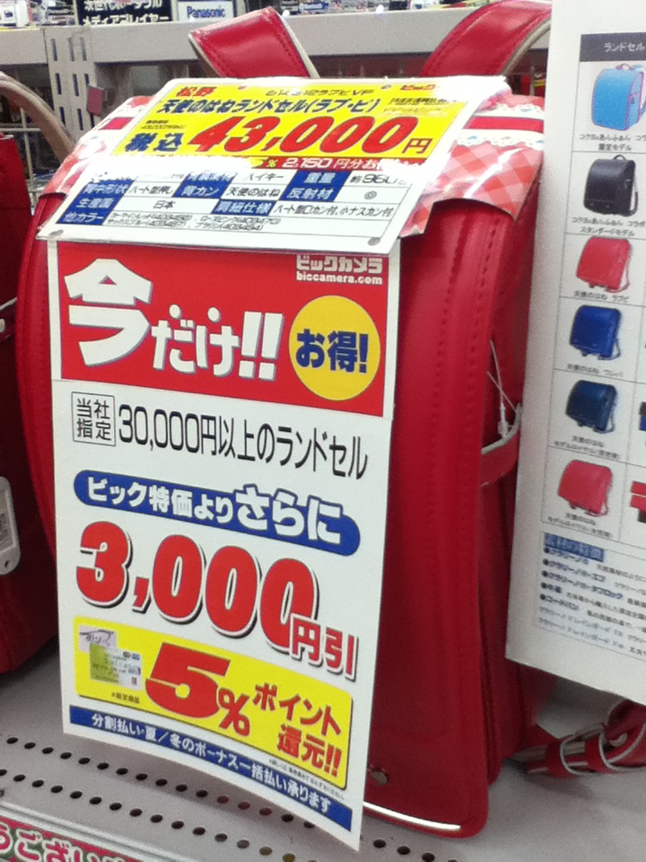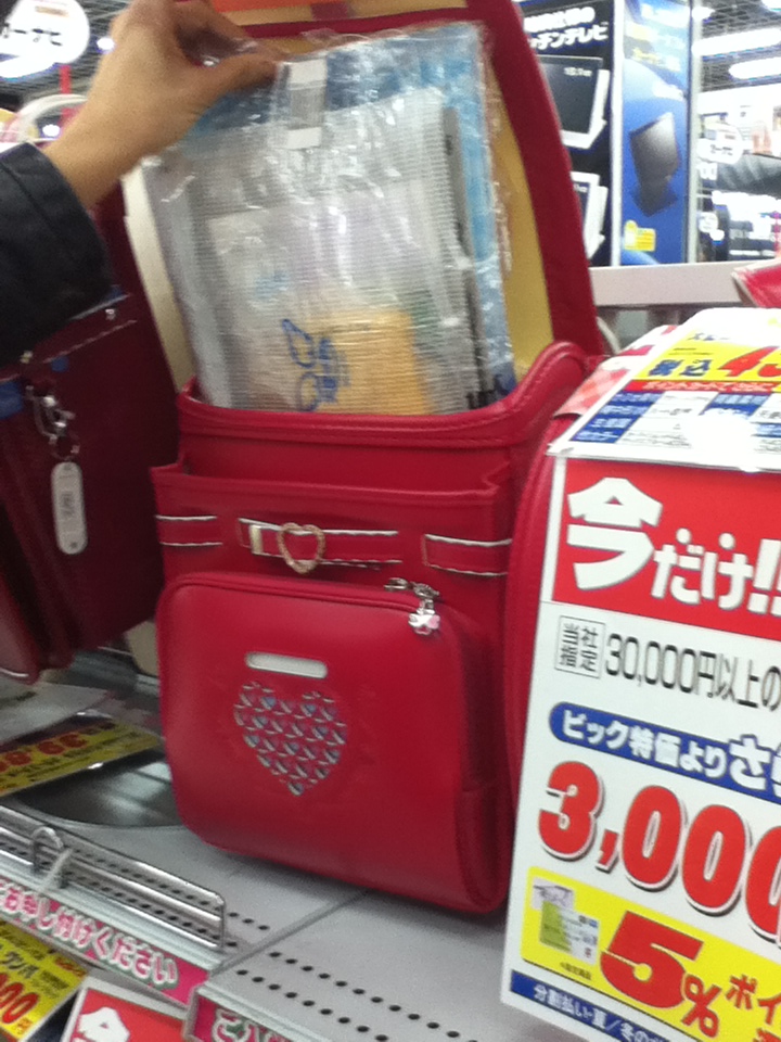 This here is a backpack for children. 43,000 yen is equal to $525.87. It is leather and sturdy, but doesn’t have room for a lunch box or bento box.