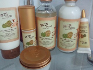 Korean women, and men for that matter take skin care and any appearance quite seriously. I have done my best this last month to jump on that bandwagon and take care of mine (every day, twice a day and not skip any!) I trucked over to SkinFood, which is really only 2 blocks from my work and compared the different treatments. For a little under $50 I was able to purchase the full regimen for troubled skin. It consists of a cleanser, a toner, spot treatment, essence, emulsion and cream.