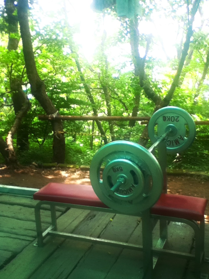 Having kept you focused through this rant, I will continue to my point. After visiting 3 gyms to which I was not impressed, I decided to go for a hike. Nature always offers up a raw intensity that’s never quite replicated by a squeaky pair of dumbbells. My hike took me to the Hwangryeong Park. Within its grounds high above the city; a soccer field, rock climbing wall, and of course, an outdoor gym. The difference however is that this outdoor gym is not the usual Korean fare. Fully functional gym equipment and a handful a free weights all available for use anytime… at no charge. The catch, hiking 40 minutes on a 60 degree incline to get there. This is where the power of the ajashi is appreciated.