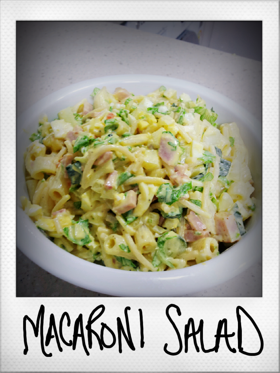 At the moment, as the afternoon dwindles away, Adam has put together three of our shelves from our extensive closet space to form a desk and I used some left overs and made Macaroni Salad.