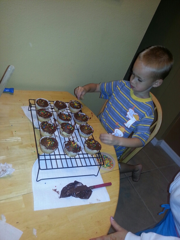 They measured and poured and stirred and mixed. They scooped the batter and put it into the pans. Then, they each iced their cupcakes. Brayden got tired after the first few, but still had the energy to coat them in sprinkles.