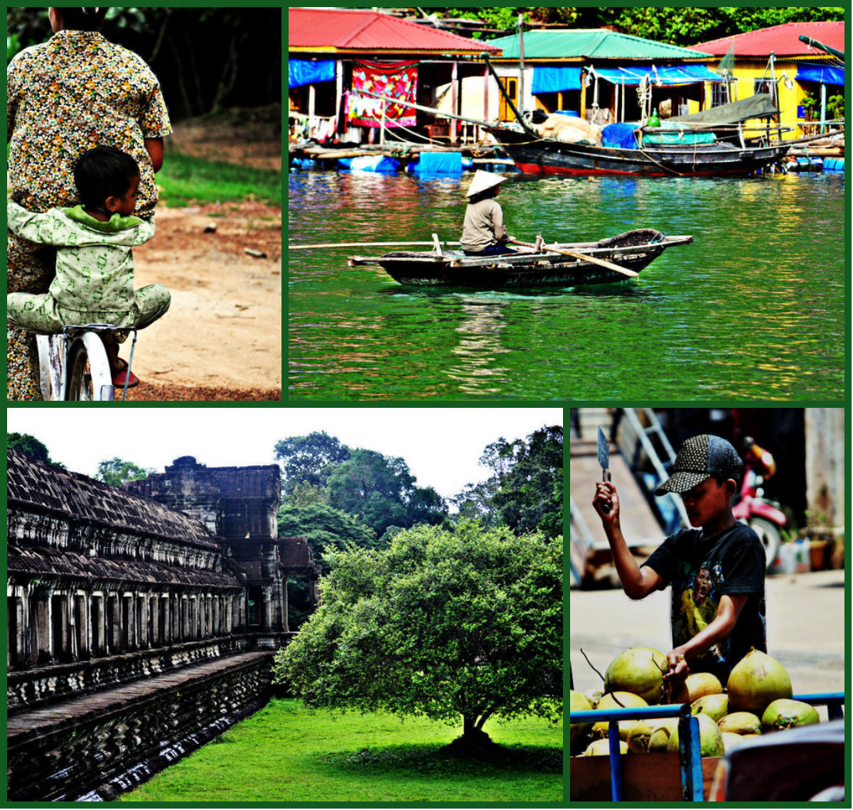 Top L. A little boy in Cambodia riding on the back of a bicycle.