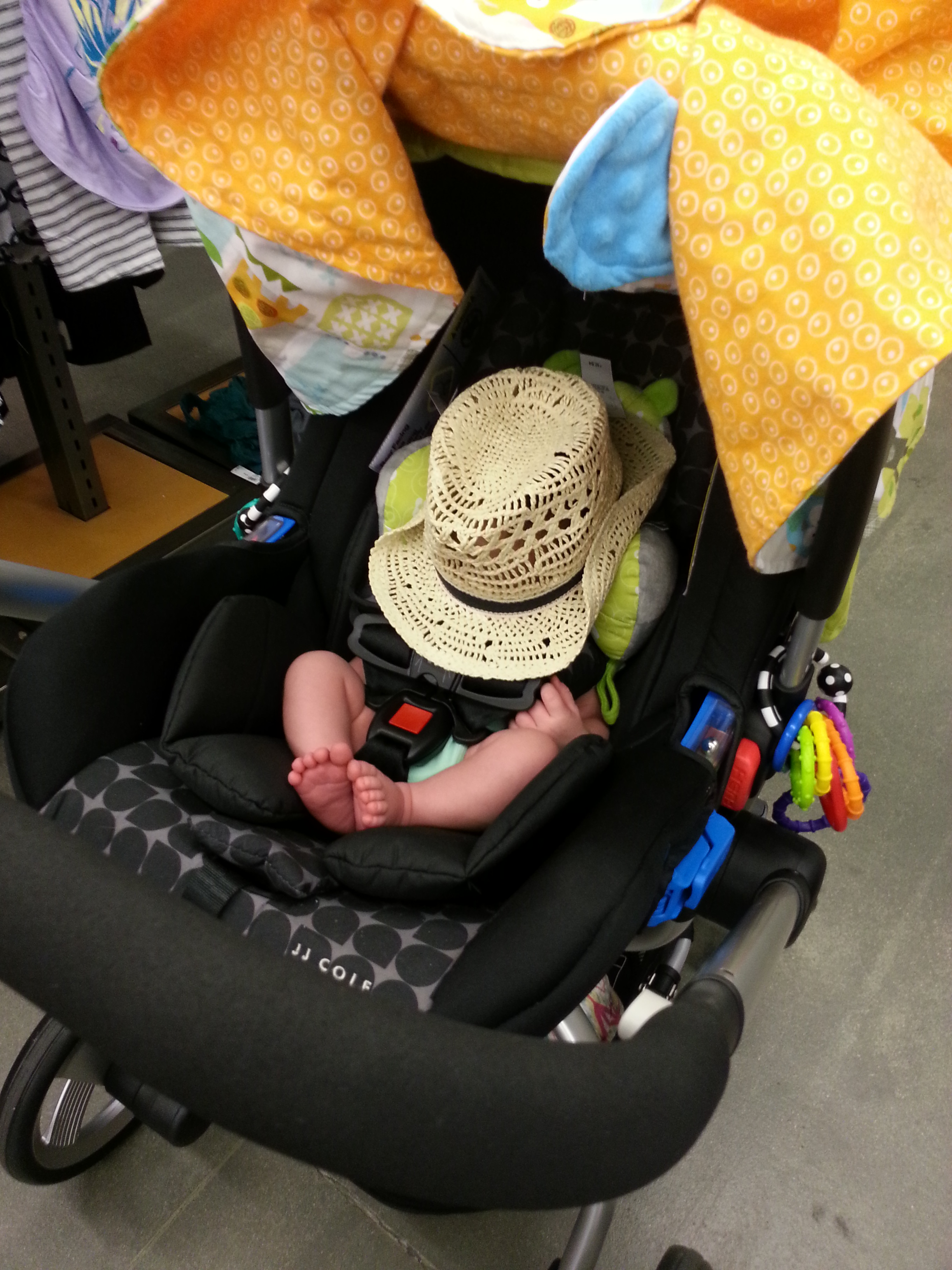 5. The Stroller/ Car Seat – Thank you to Aunt Shannon,Uncle Shawn and Grandma Maryanne. The JJ Cole Broadway stroller is so maneuverable and stylish looking. Gavin falls asleep right away in the car seat, although he looks so incredibly small in it. We also have this great head rest from one step ahead. (we were trying on hats, which were all too big, and we actually don’t have a great shot of the stroller yet…will update when we do) We also need to find a cup holder that fits on this thing!