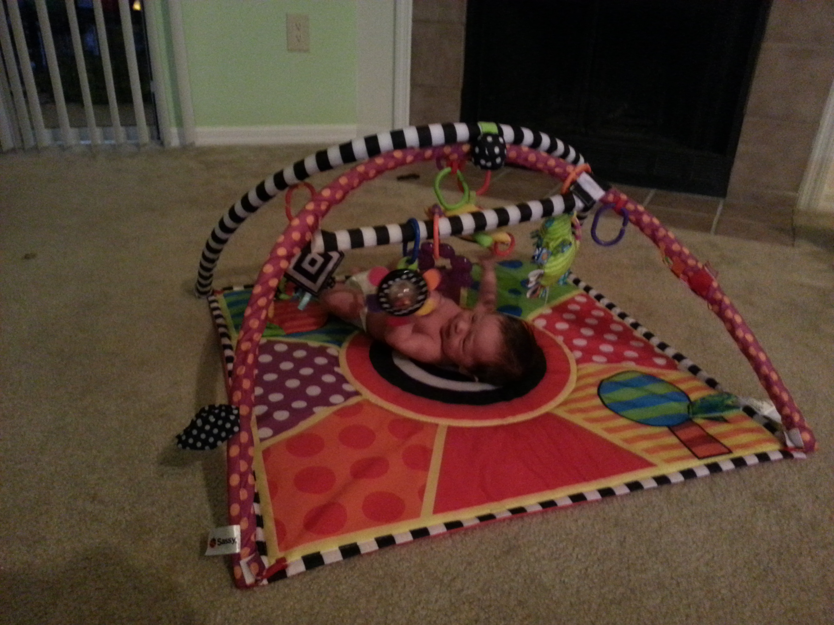 3. The Floor Mat Gym – Tummy Time, Back Time, Play Time and Eunee sniff time, thank you Babbitt family. We have the Sassy Sensory Gym, Gavin spends about an hour a day, in 10 minute increments, settled on this thing. Already at 2 weeks he is pulling at some of the toys and kicking them…No, it isn’t his reflexes he is the smartest baby alive and does it purposefully.