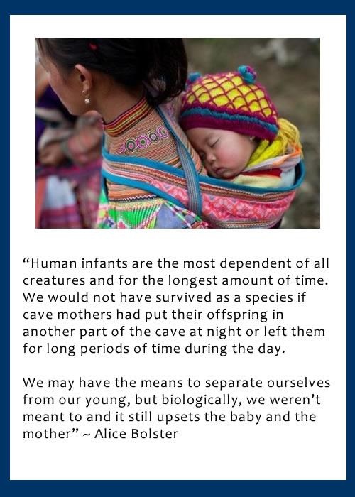 • Infants who are carried are calmer because all of their primal/survival needs are met. The caregiver can be seen, heard, smelled, touched, tasted, provide feeding and the motion necessary for continuing neural developmentgastrointestinal and respiratory health and to establish balance (inner ear development) and muscle tone is constant.