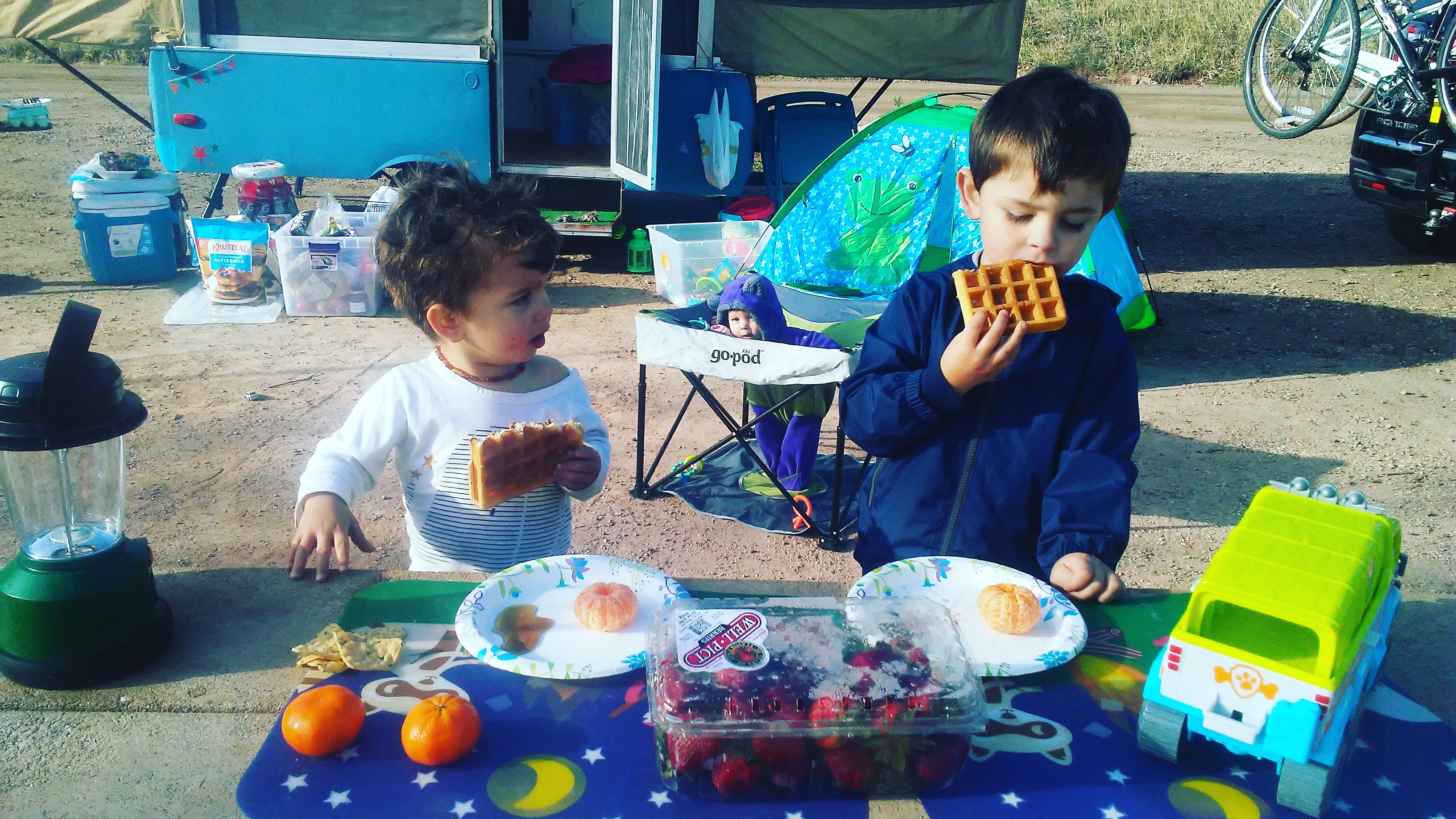 We have all the great family items to camp with, our waffle iron, a go pod, a bike trailer, a clip on high chair, a small portable grill, an electric kettle, a bin of outdoor toys, bubbles and even a kindle with videos for emergiences (moms you know what Im talking about)