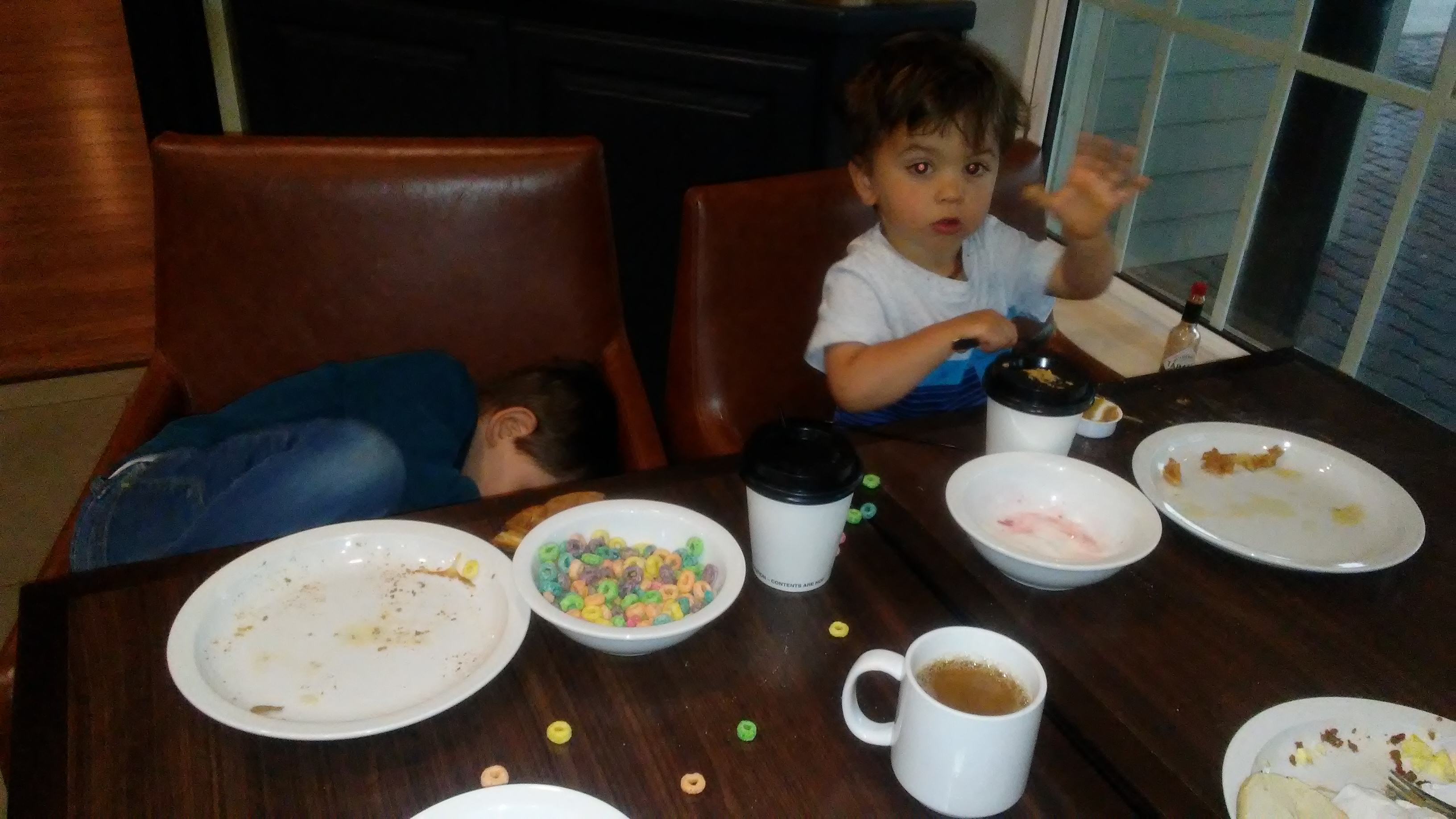 We attempt to pick sleeping arrangements between the pack and play, a sofa bed and one or two beds in the room. After flailing around, jumping between and possibly finally picking a resting spot….someone will fall asleep, someone else will flail or scream resisting sleep and wake the previous mentioned up.